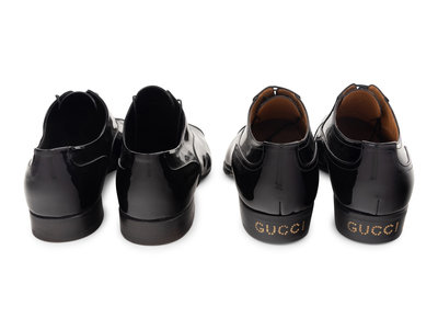 Black patent leather lace-up Oxford shoes with leather and rubber soles, and heels with "GUCCI" pin detail.