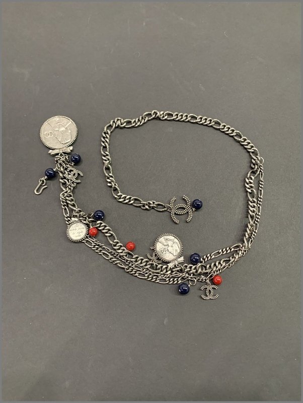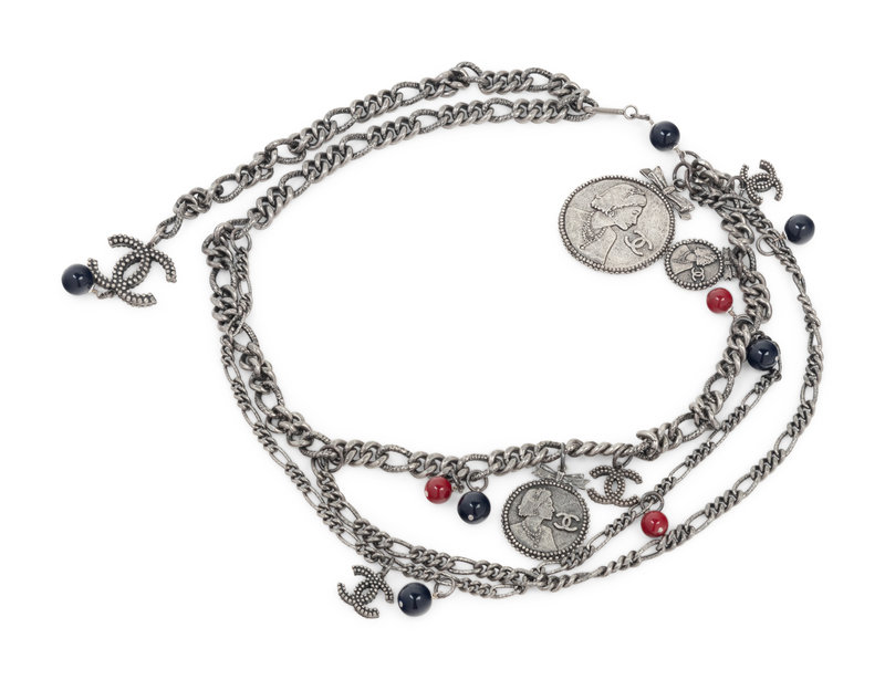 Ruthenium metal chain belt with black and red beads and drop charms with CC logo, Coco Chanel silhouette, and text, Autumn 2004.