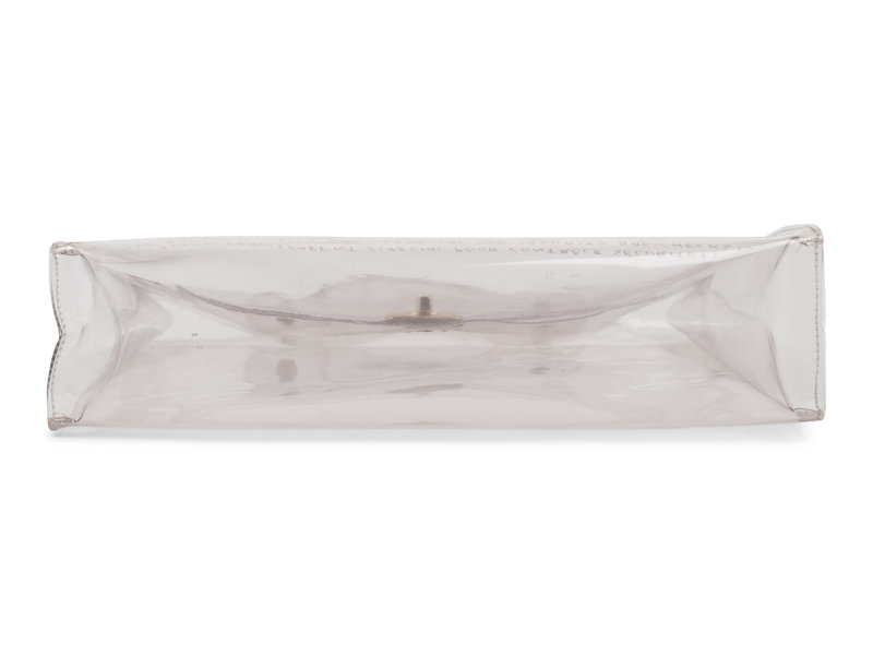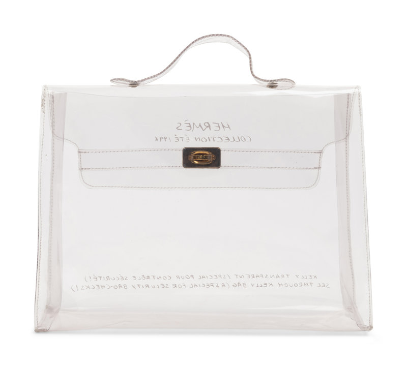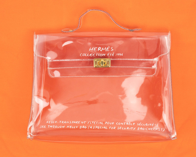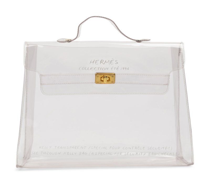 Transparent PVC Kelly bag with gold-tone hardware. Printed on the bag: "Hermès / Collection été 1996" "See Through Kelly Bag (A Special For Security Bag-Checks!)"