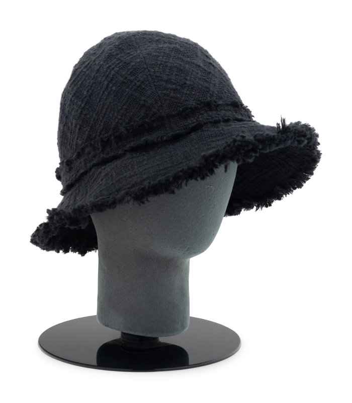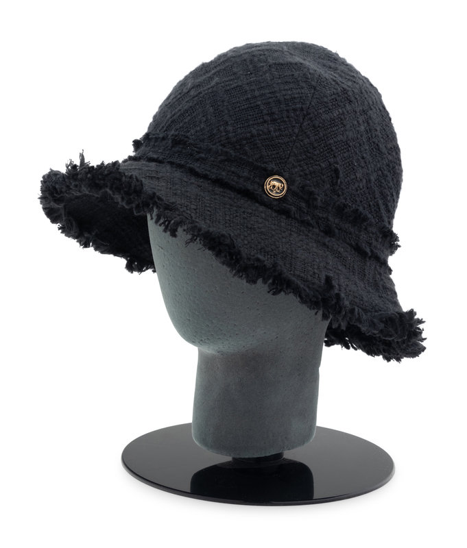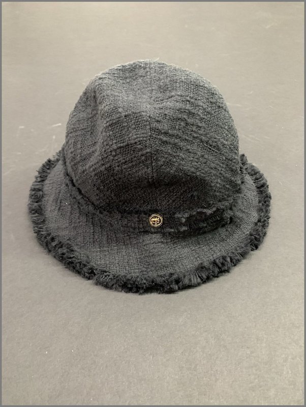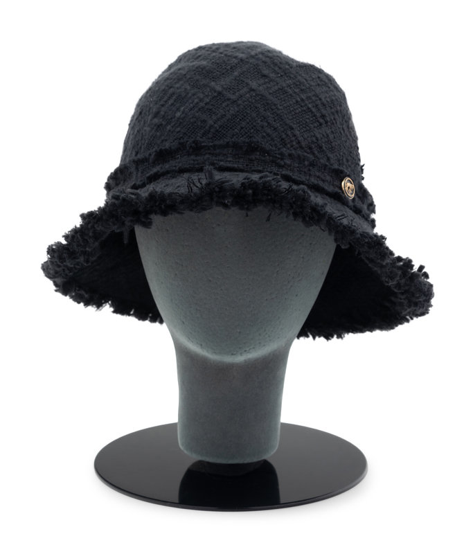 Black cotton tweed bucket hat embellished with elephant and CC logo button. Found with original sales tag, listed price: $1,100.