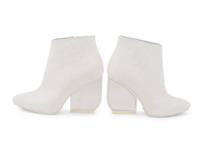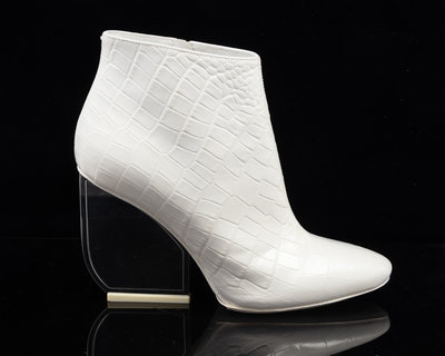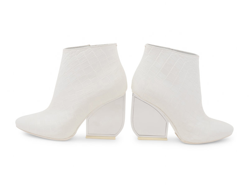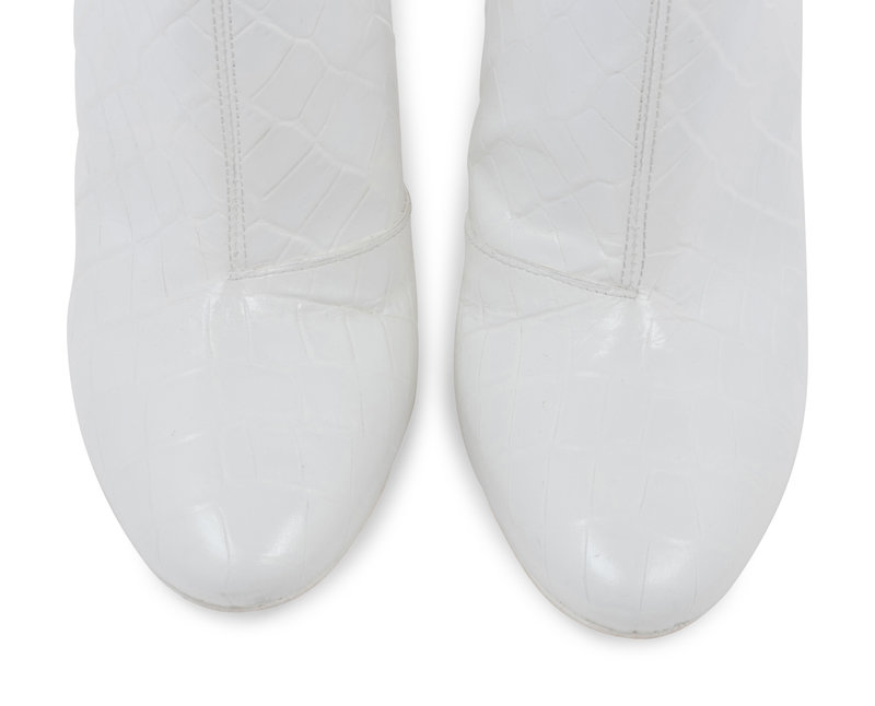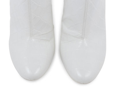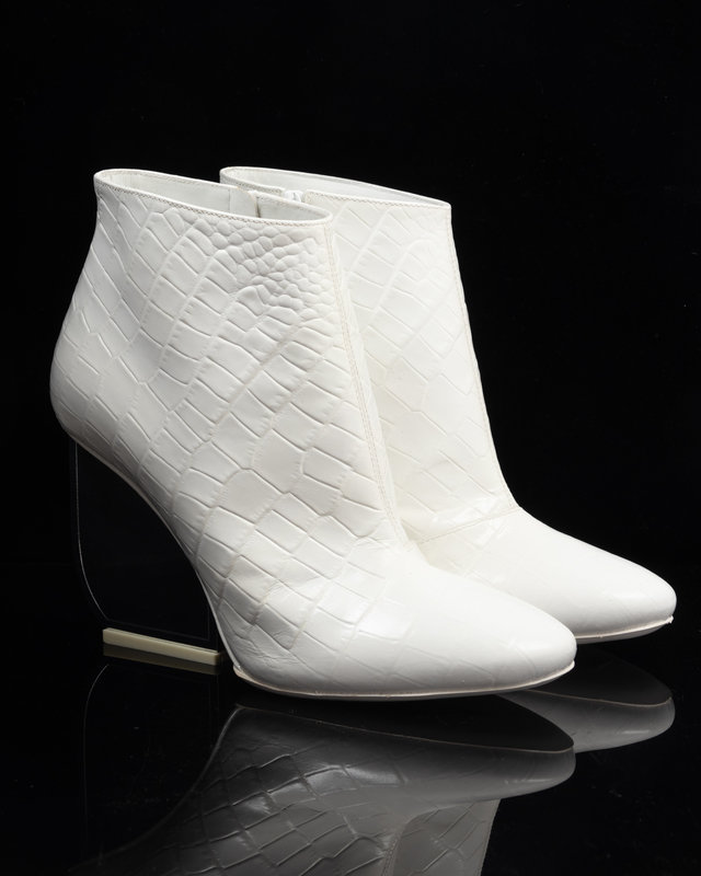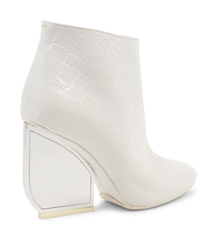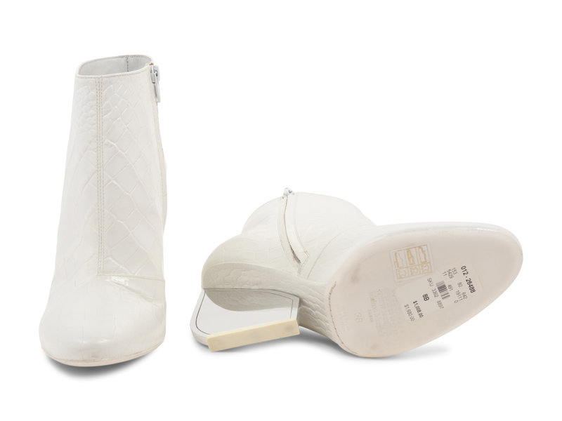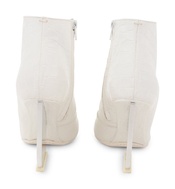 White alligator embossed leather ankle boots with flattened silver-tone mirrored heels and side zip closures. Found with original sales tag, listed price: $1,680.00.
