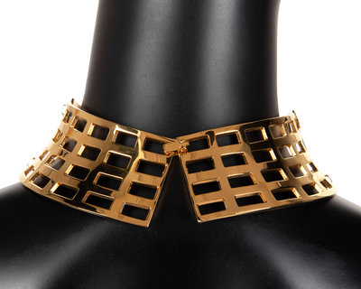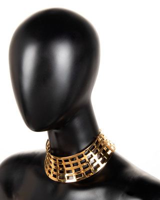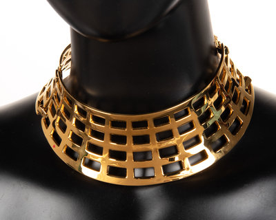 Gold-tone metal grid collar choker with back neck clasp closure. Identical style worn by Beyoncé Knowles in Michelle Williams' "Say Yes" music video.