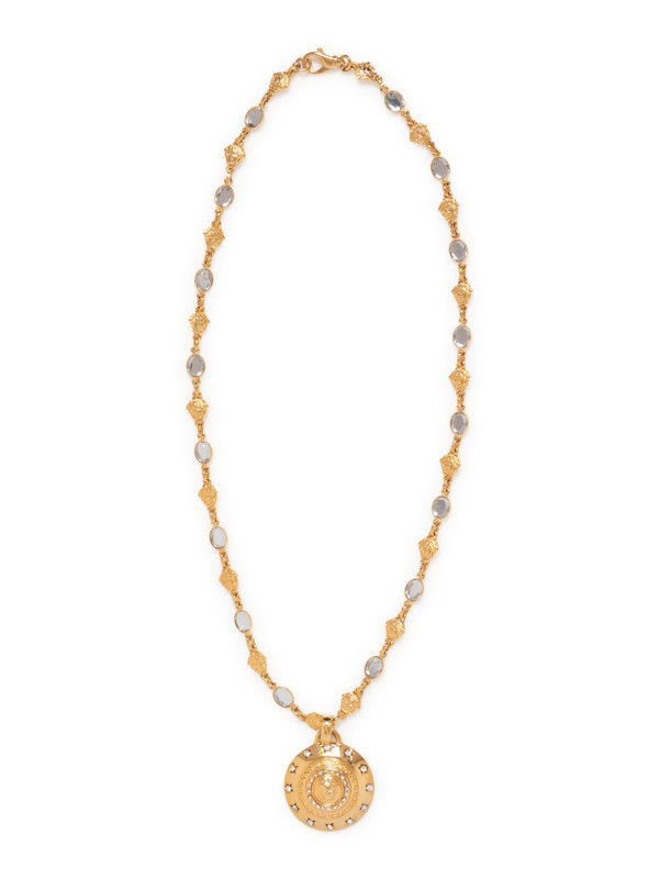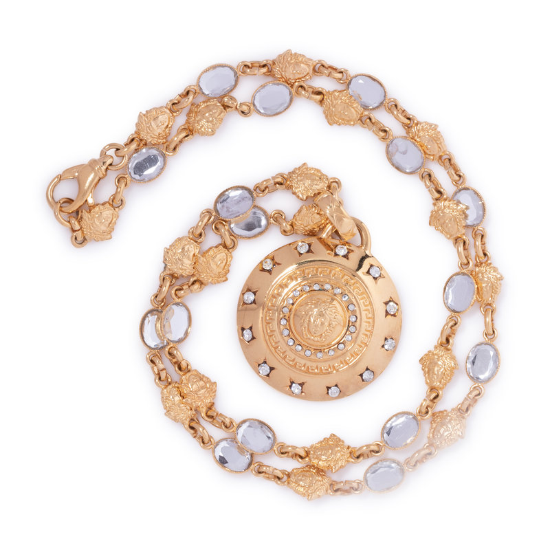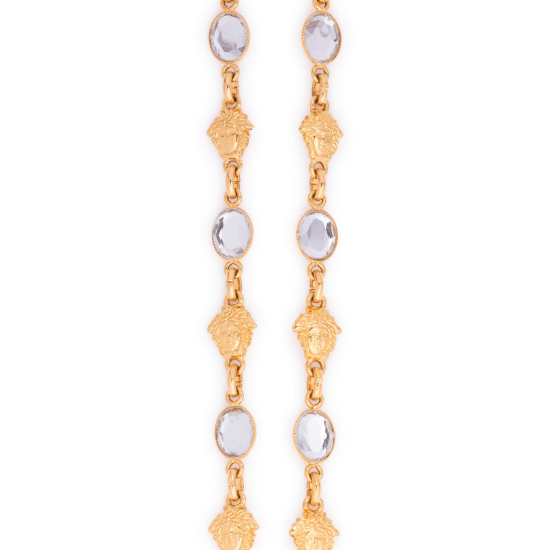 Gold-tone chain necklace with Medusa head and clear faux gemstone links and Medusa head shield drop pendant set with clear stones.