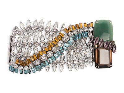 Multi-strand clear cut, orange, blue, bracelet with large green and brown cut stones set with yellow and purple, silver-tone metal settings, and slide barrel clasp.