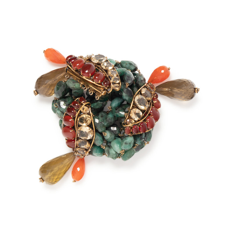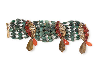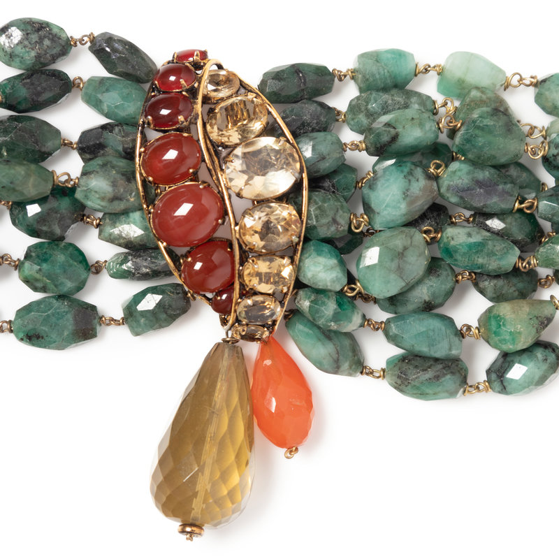Multi-stranded faceted green stone bead bracelet with three large smoky yellow faceted drops, red oval stones, three faceted orange drops, and three light yellow oval faceted stones.