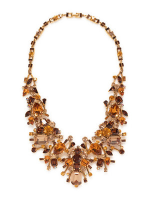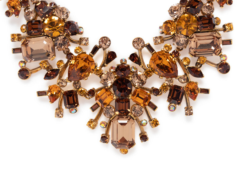 Gold-tone square link chain cluster necklace with multi-shaped faceted stones in brown, yellow, and orange.