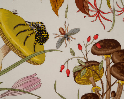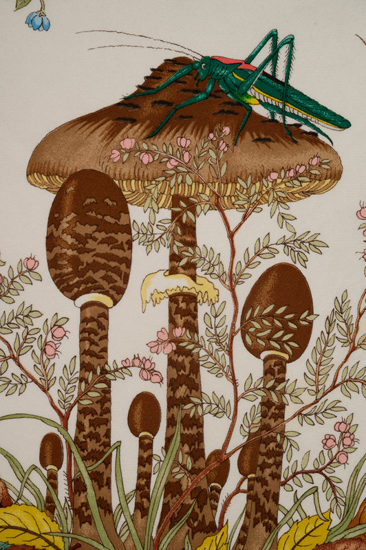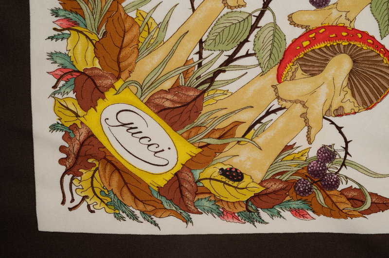 Gucci silk scarf with animals, plants and insects on white ground with brown border.