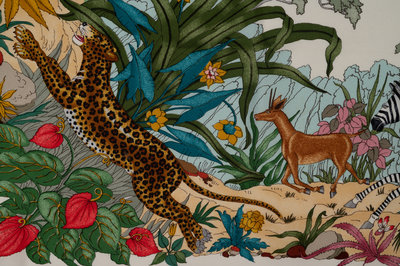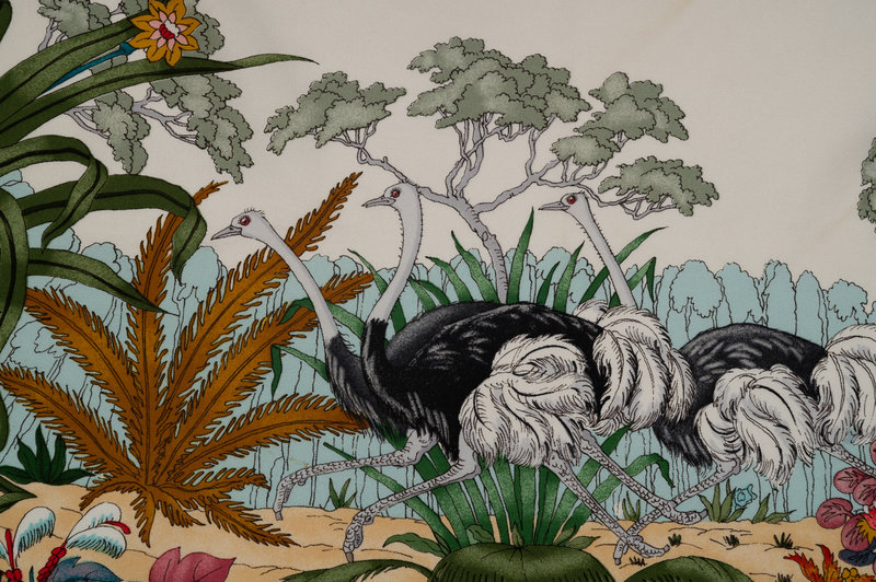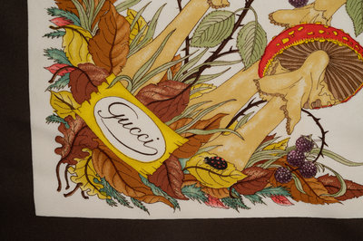 Gucci silk scarf with plants and exotic animals on white ground with taupe border.