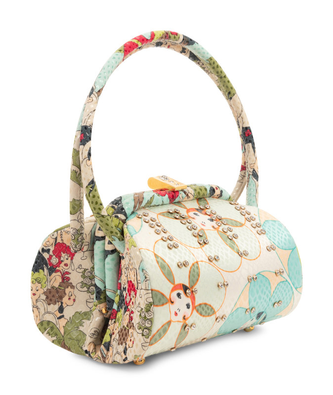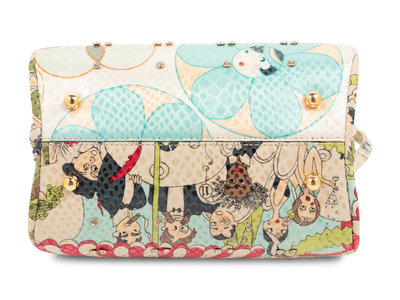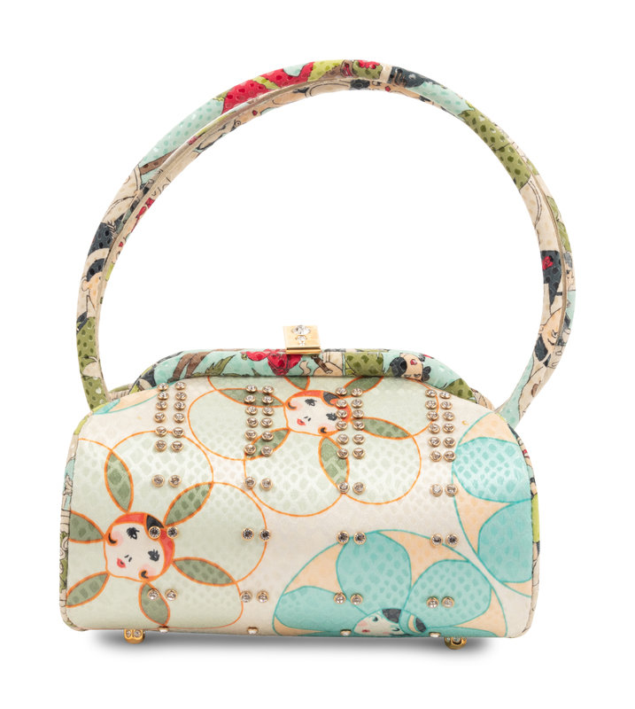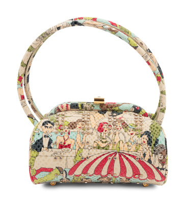 1920s café scene printed frame bag embellished with set rhinestones. Found with original sales tag, listed price: $1,040.00.