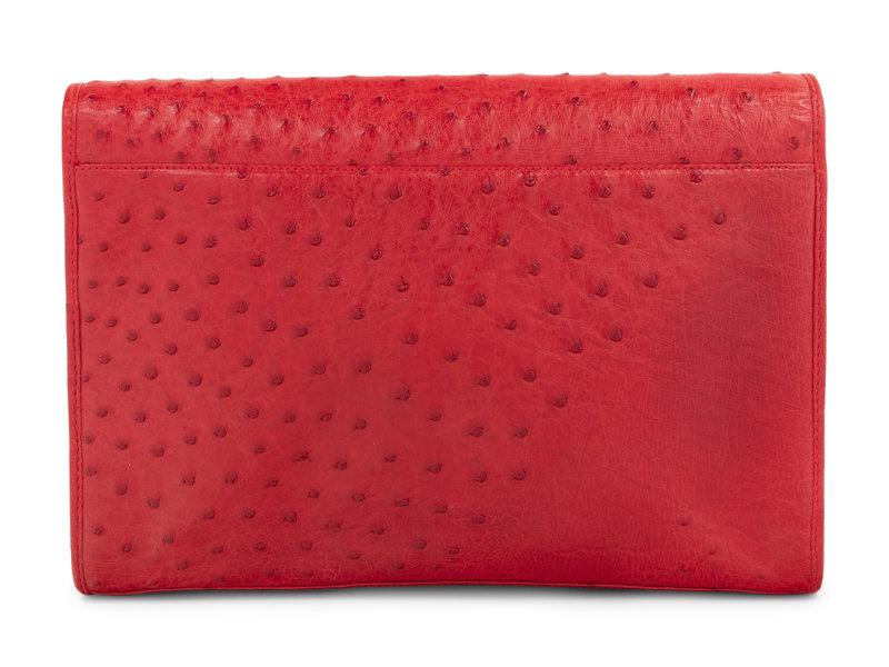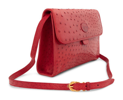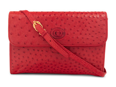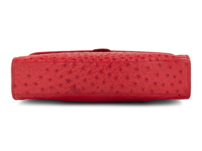 Red ostrich flap bag with gold-tone hardware and detachable buckle strap.