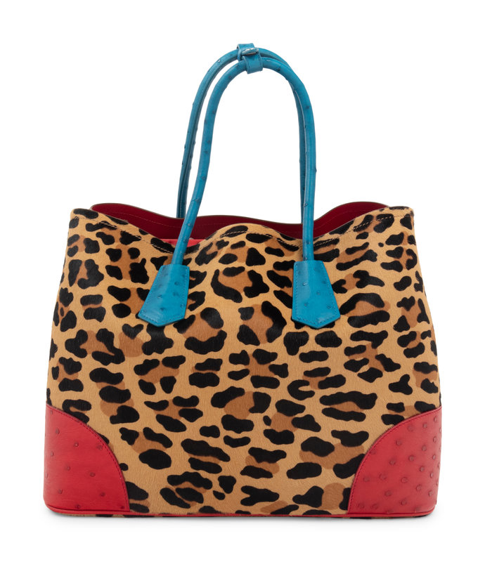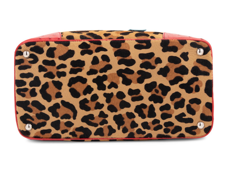 Brown leopard print calf hair two compartment tote bag with blue and red ostrich accents.