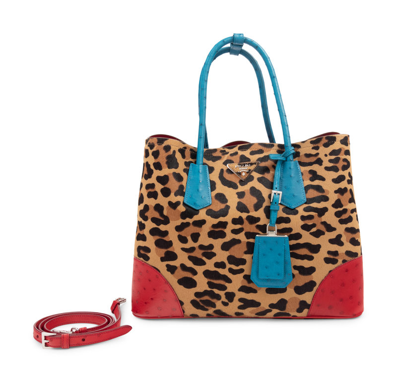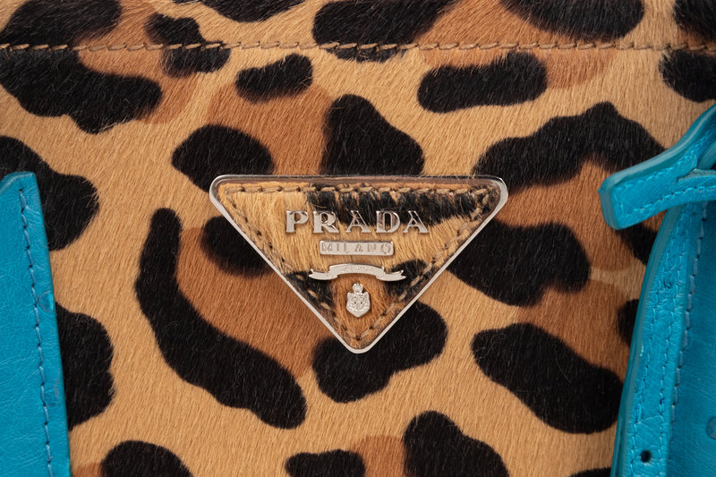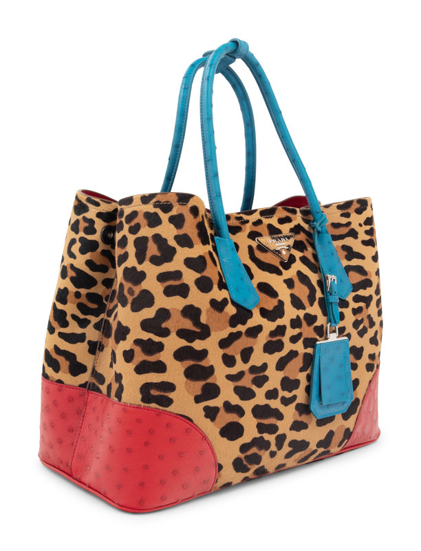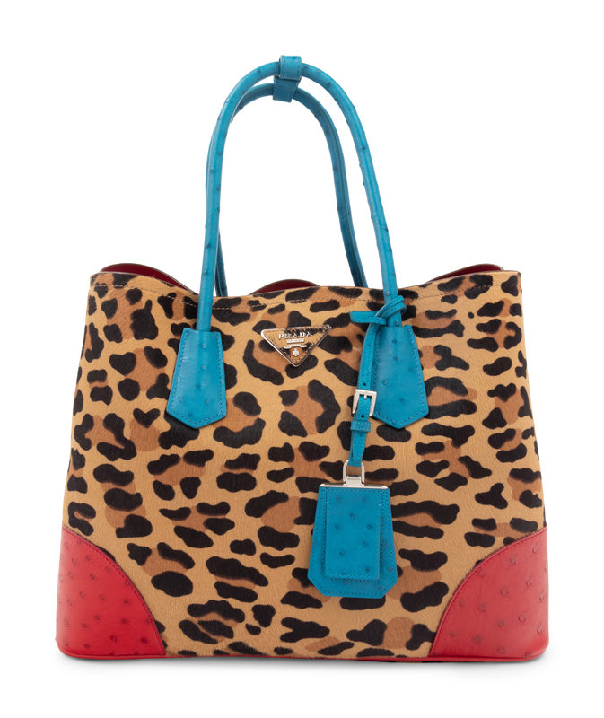 Prada Leopard Print Calf Hair and Ostrich Tote Bag