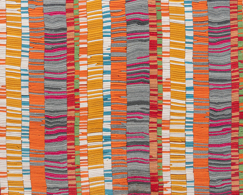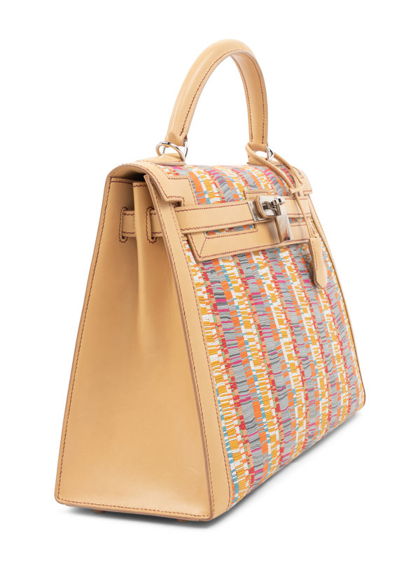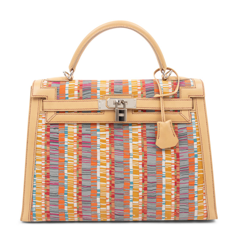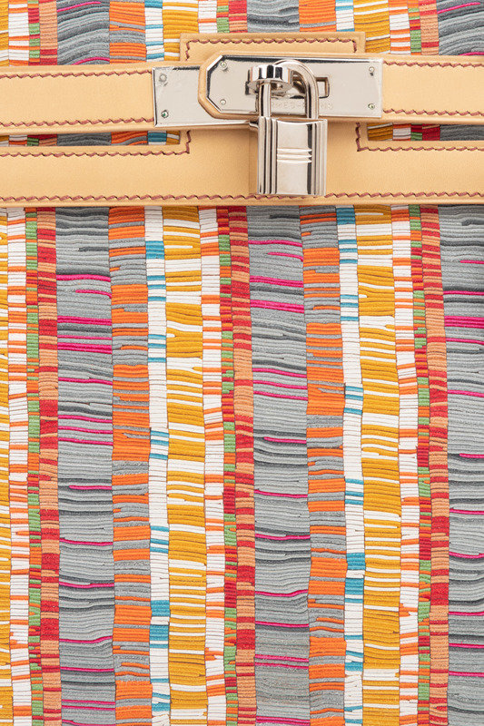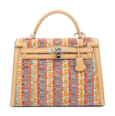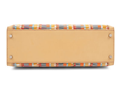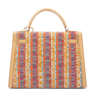 Multi-hue stripe Vibrato snip leather Kelly bag in camel leather with top handle, detachable shoulder strap, and front twist lock closure with keys in clochette and lock.