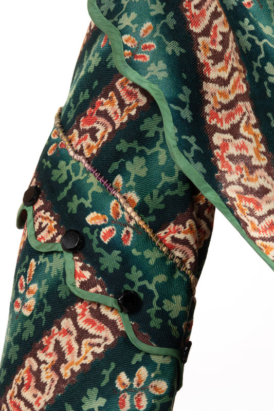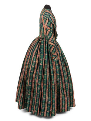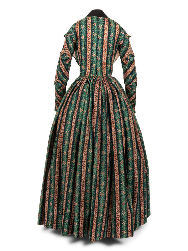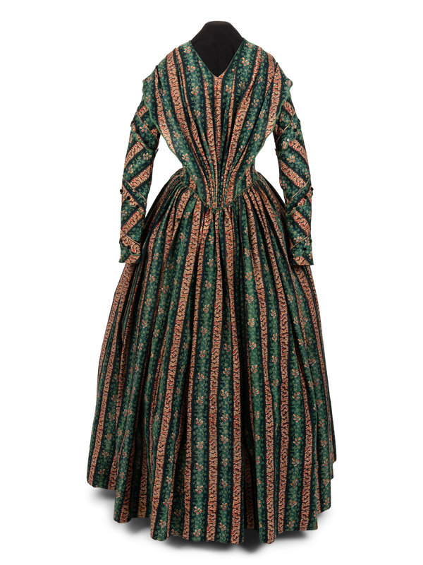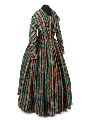 Green, red, brown, and ochre printed wool twill day dress with pleated and boned bodice, tiered long sleeves embellished with green satin ribbon edging and black faceted buttons, full skirt cartridge pleated into the waist, and center back hook and eye closure. The center front neckline has been tacked shut from the top edge to about the base of the sternum suggesting some form of access, possibly for breast-feeding.
