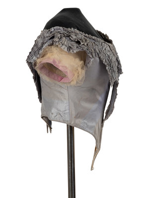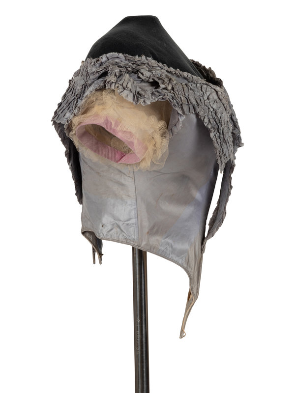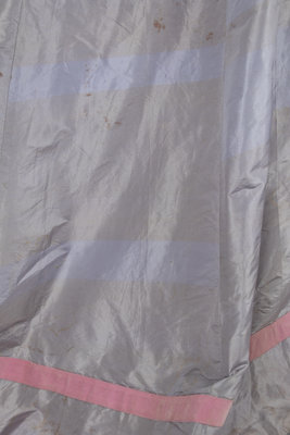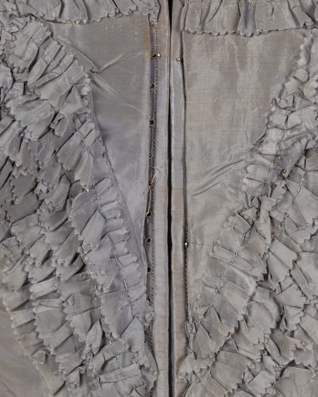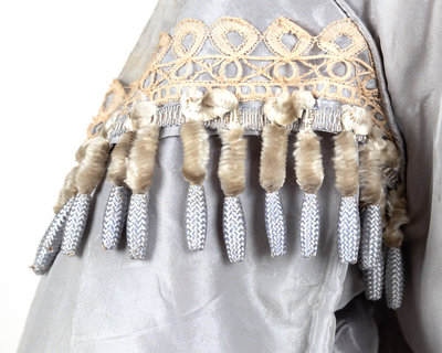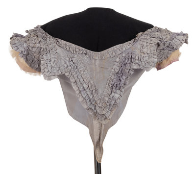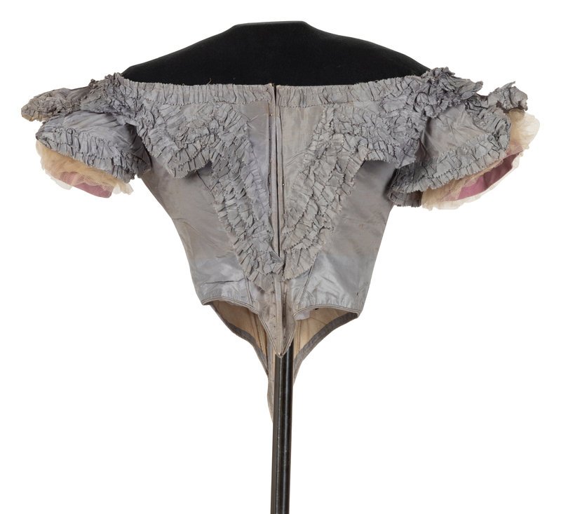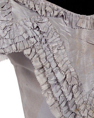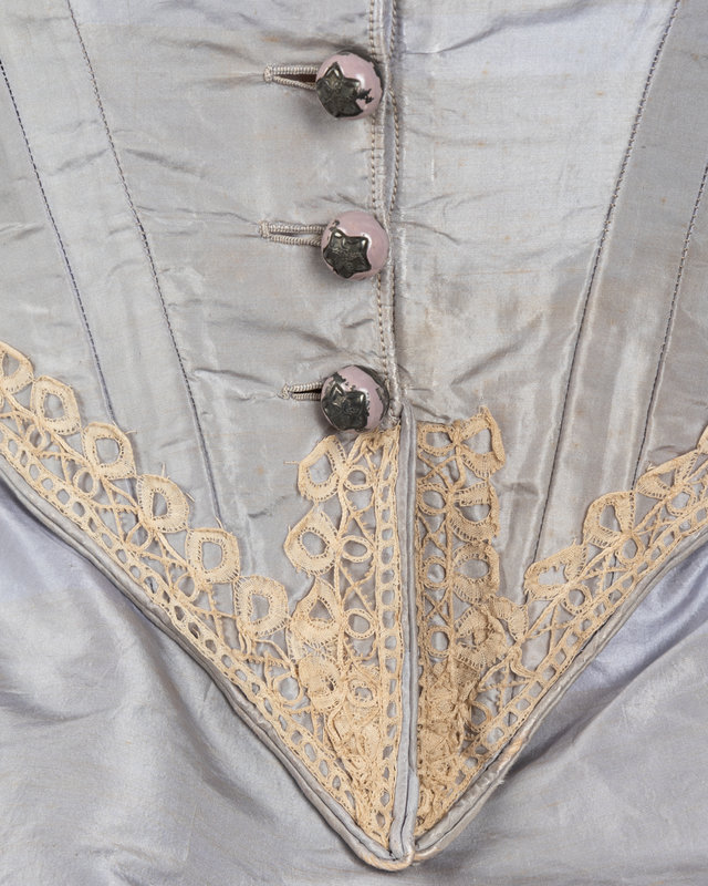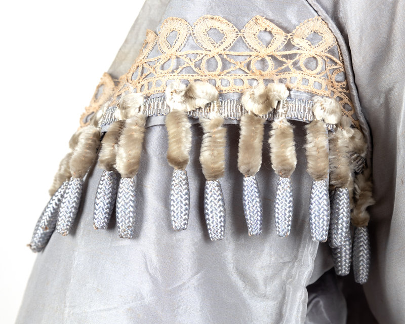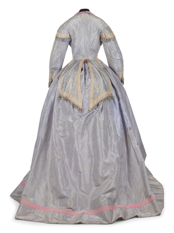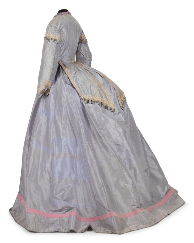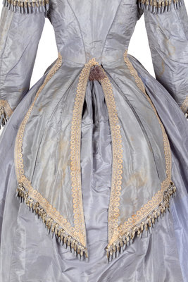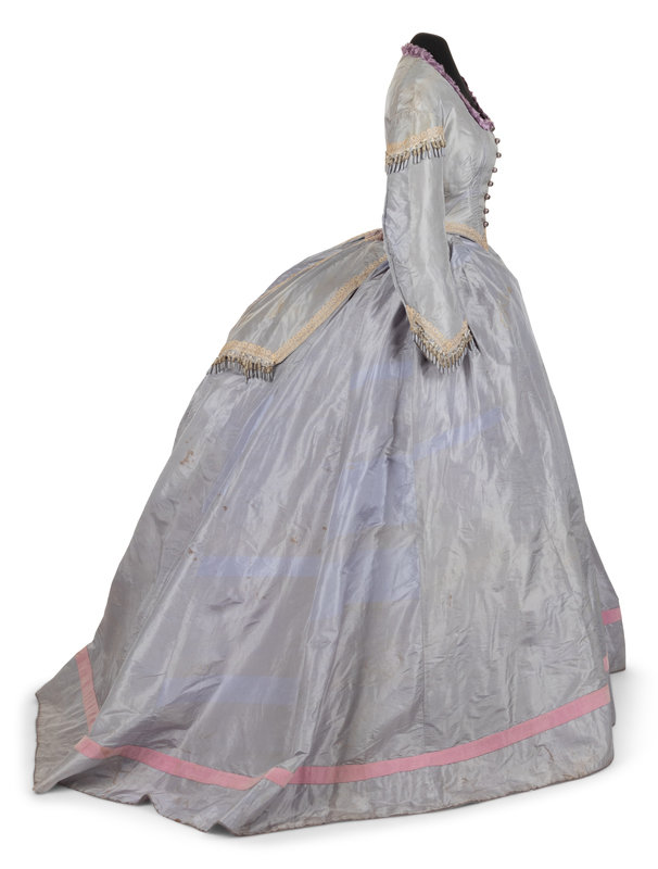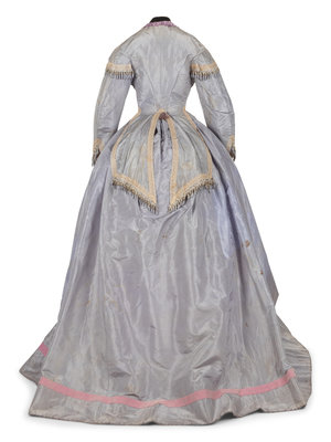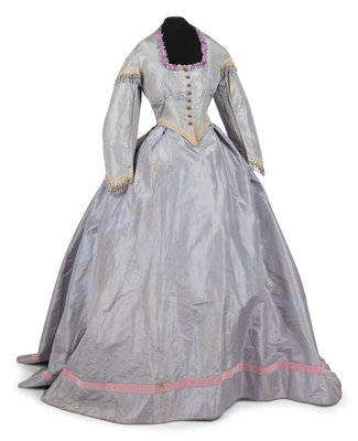 Blue silk taffeta dress trimmed with pink ribbon, purple silk, white lace, and blue chenille fringe. The day bodice is trimmed with purple silk along the box cut neckline, dropped shoulder long sleeves, front button closure, and lined with white cotton. The evening bodice has an open neckline trimmed with ruched self fabric, short cap sleeves with white net and pink ribbon, and center back lace-up closure. The full skirt is made with vertical godets and heavily gathered into the waistband at the center back.