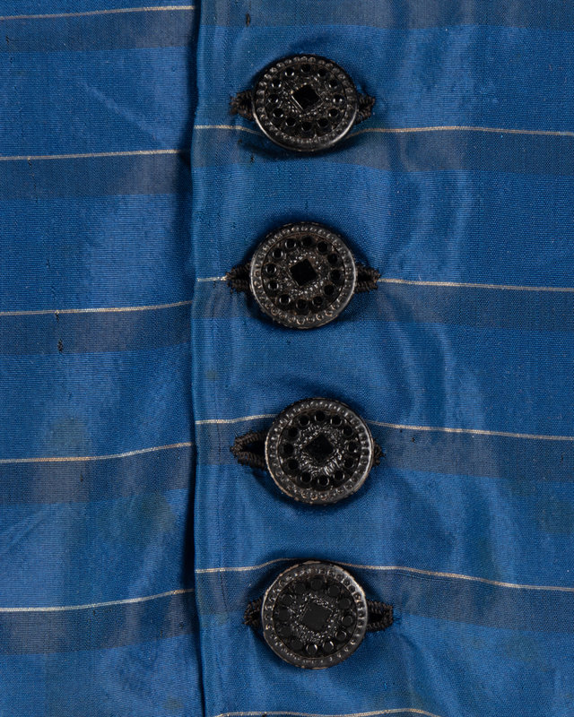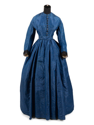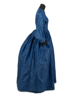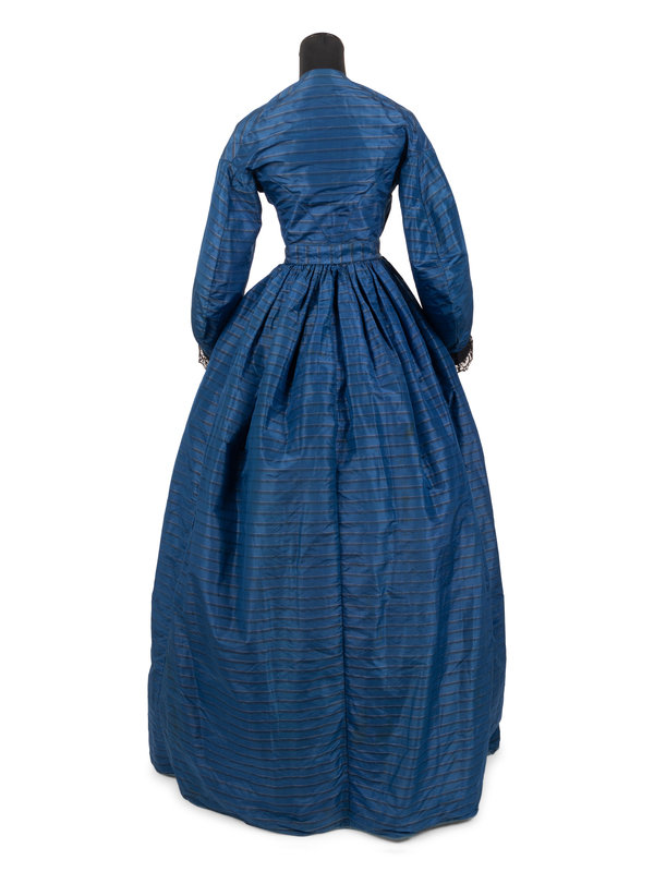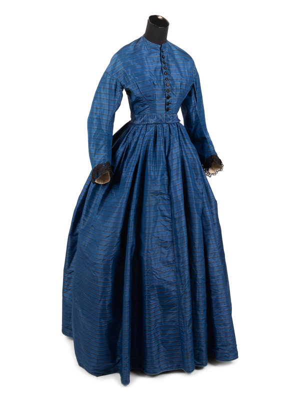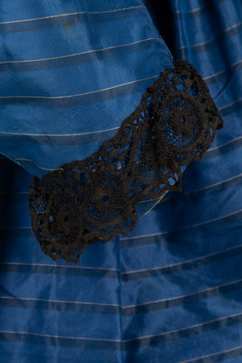 Blue silk striped taffeta dress with jewel neckline, drop shouldered sleeves trimmed with black lace, a full skirt gathered into waist, and center front black button closure.