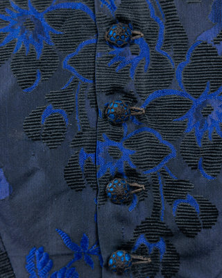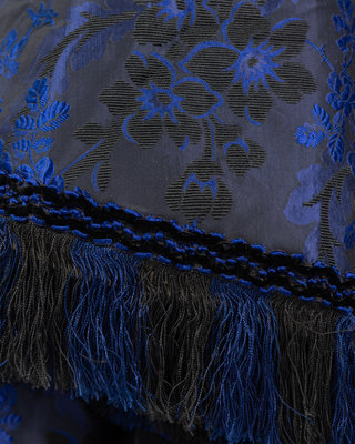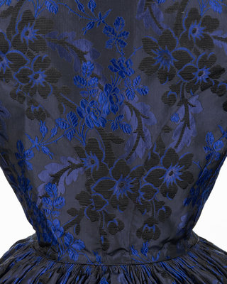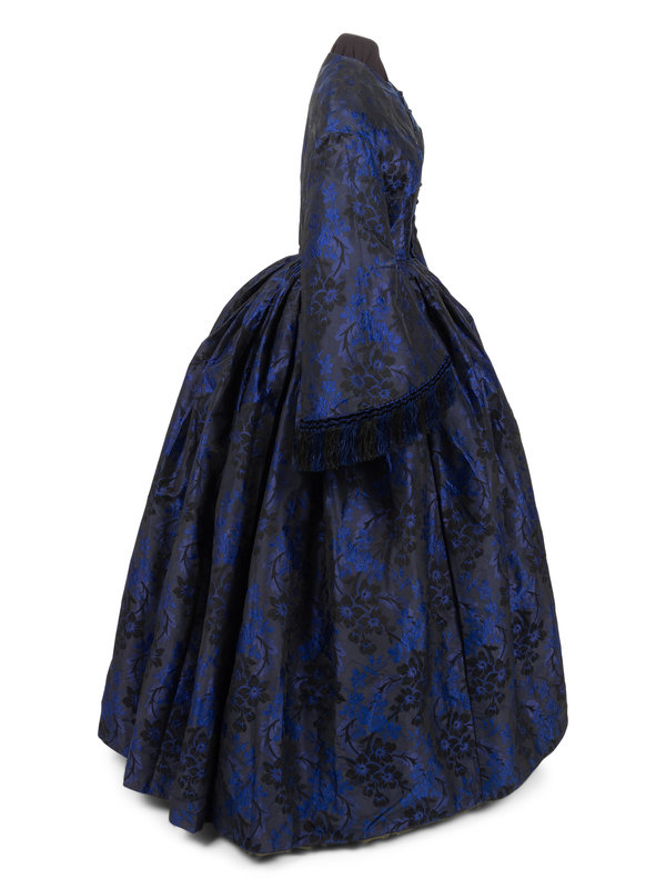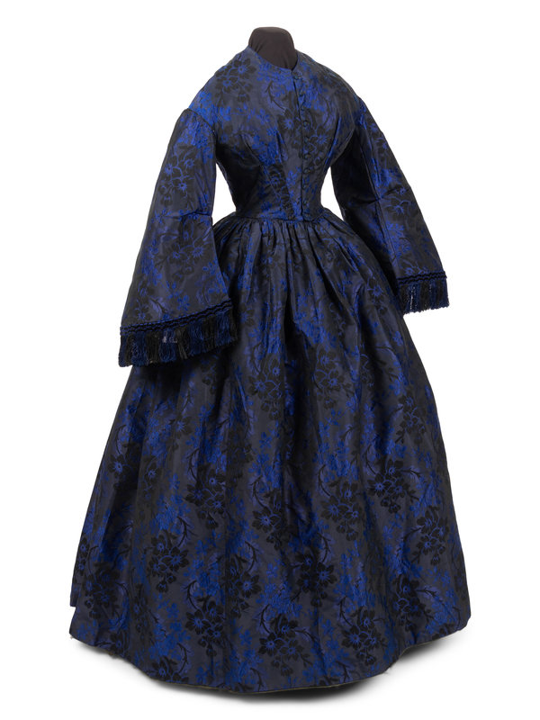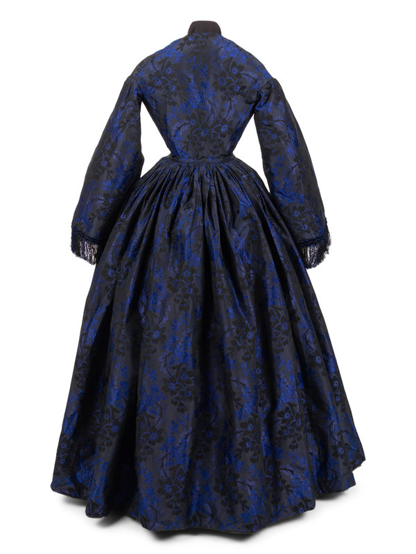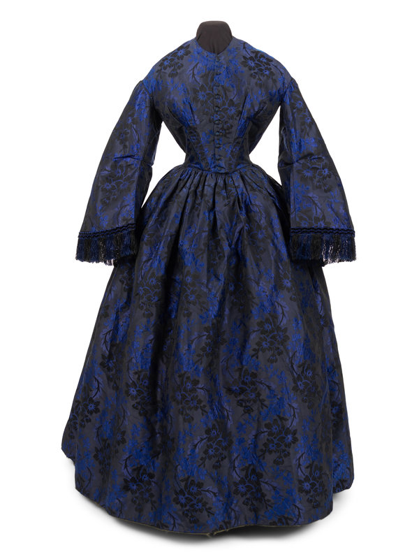 Dark blue and black silk jacquard brocade with floral motif, jewel neckline with dropped shoulders that have long full sleeves trimmed in blue and black chenille and silk chain fringe, a full skirt gathered into the waist, and center front button closure with chainstitched covered buttons.