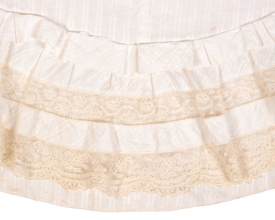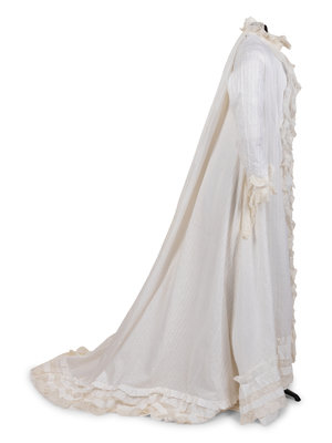 White cotton satin striped long sleeve night gown trimmed with cotton handmade lace and center front shell button down closure. The back of the night gown is in the Watteau style with interior skirt tie-backs and hemmed with pleated ruffles of self fabric and lace.