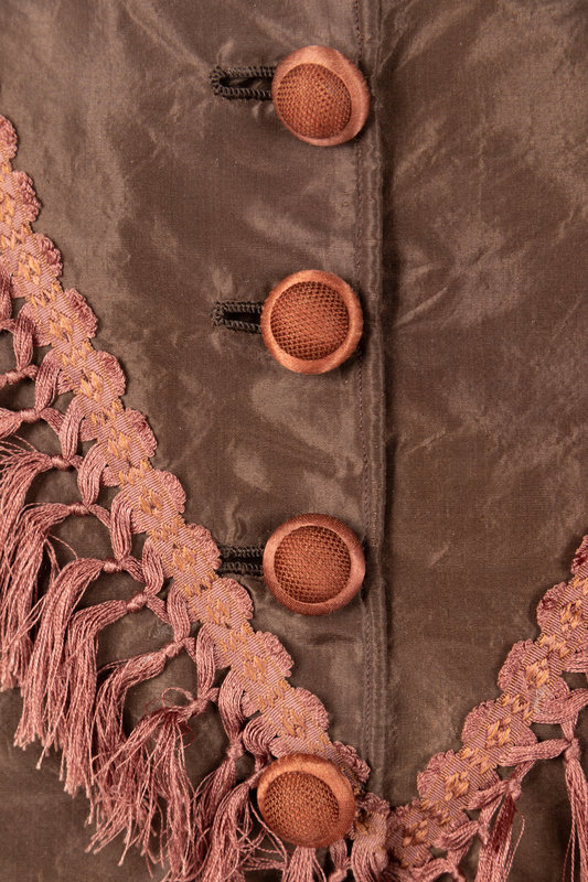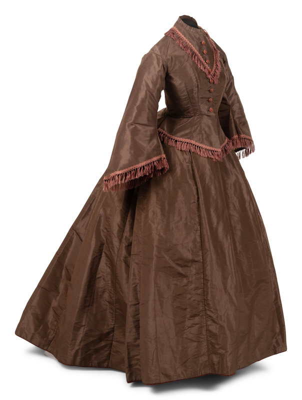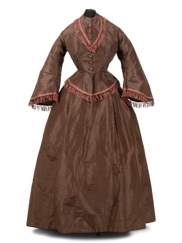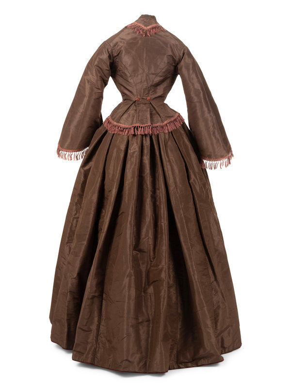 Brown silk taffeta two-piece dress ensemble including a fitted bodice with stand collar, flared sleeves, trimmed with brown silk brocade ribbon and tassels, and center front covered button closure; paired with matching brown silk taffeta skirt that is gathered into the back waistband.