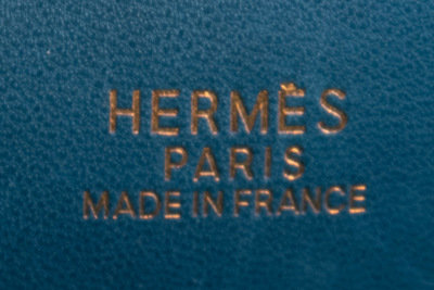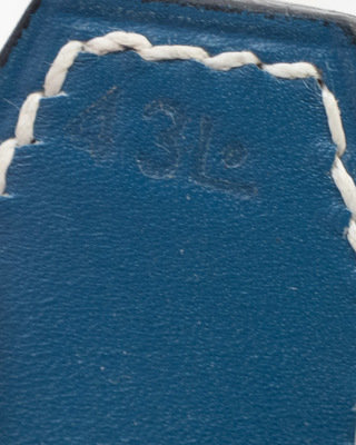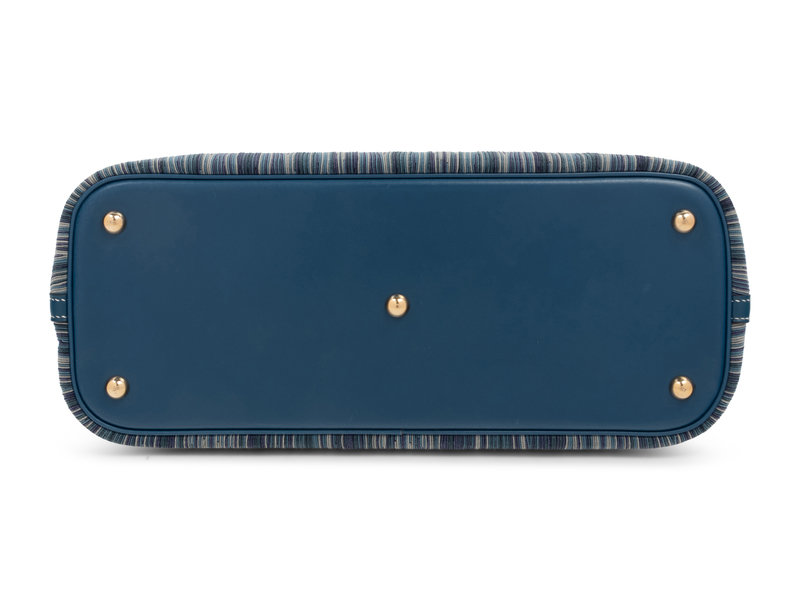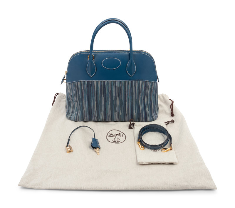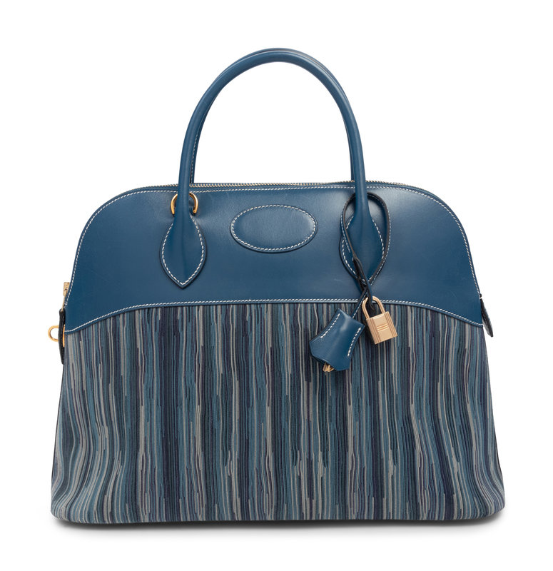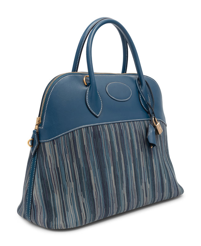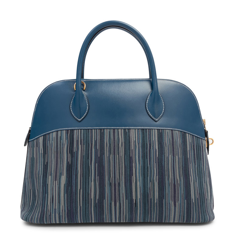 Vibrato leather Bolide bag in variegated blues trimmed in blue thalassa leather, dual top handles, gold-tone hardware, and top zipper closure.