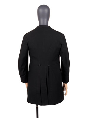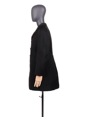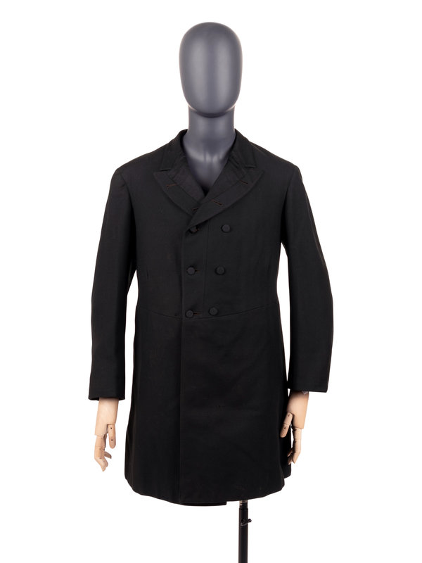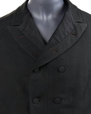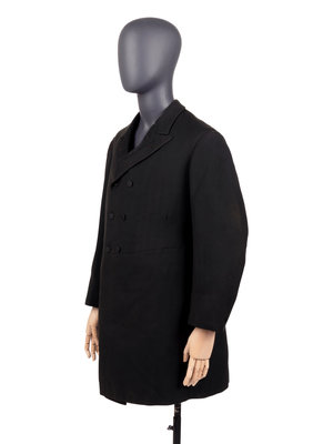 Black wool twill double breast overcoat with peak lapels faced with black ribbed satin, straight fit sleeves, and coattails with inset pockets.