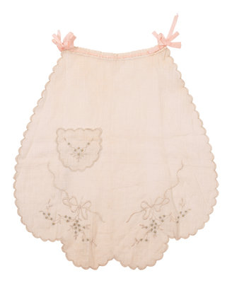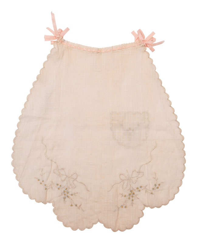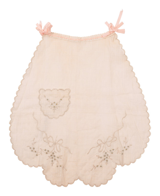 White cotton lawn and grid scalloped edge apron with floral embroidery, small pocket, and pink ribbon. 1910.