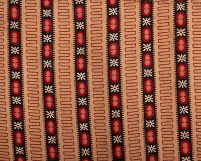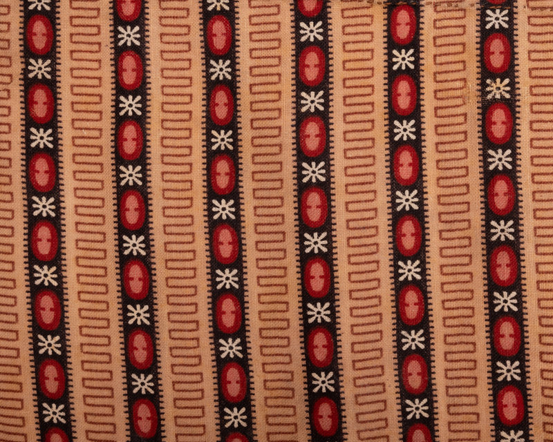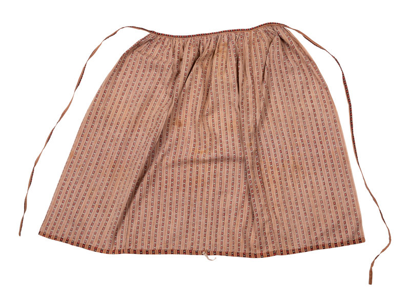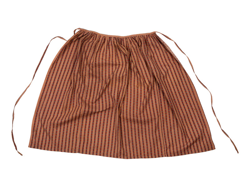 Brown printed apron with red, white, and black geometric shapes, and waist ties. 1850s.
