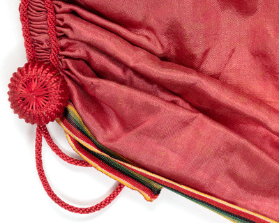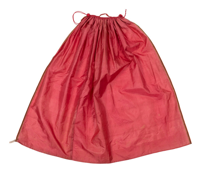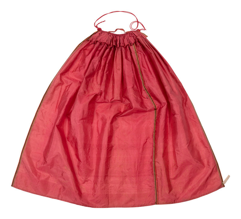 Red silk selvage-cut apron gathered into red braid with loop and button closure. 1840-1870.