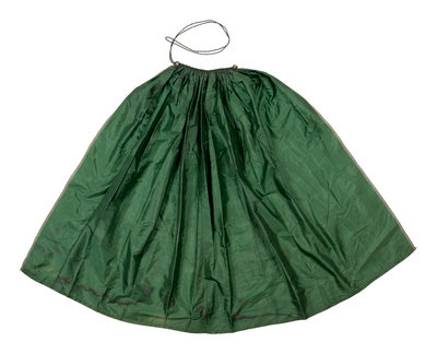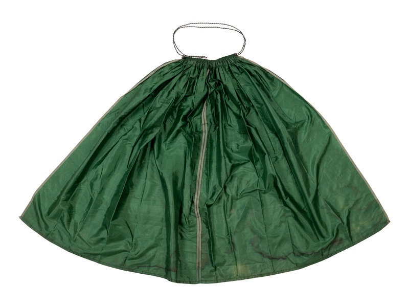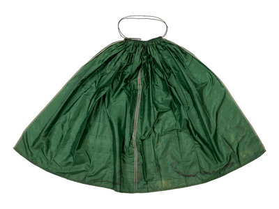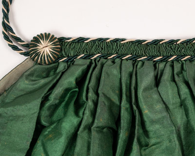 Green silk selvage-cut apron gathered into green and white braid with loop and button closure. 1840-1870.