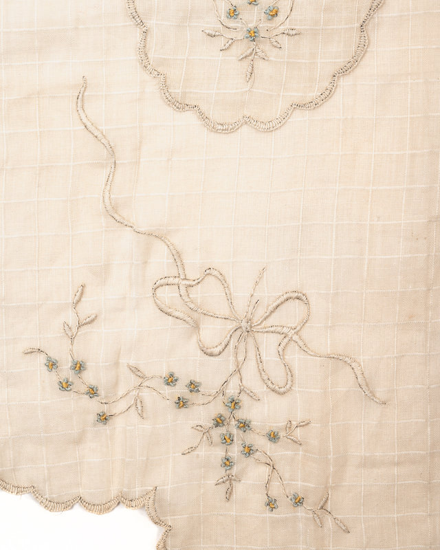 White cotton woven plaid apron with floral motif, waist ties, and trimmed in cotton eyelet lace. 1900.