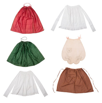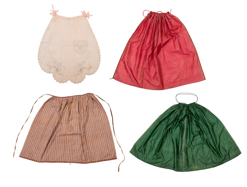 This lot includes six aprons from the Tasha Tudor Collection of the Colonial Williamsburg Foundation. Tasha Tudor (née Starling Burgess, 1915-2008) was a writer and illustrator of children’s books, including Mother Goose and Corgiville Fair. The idyllic, 19th century world she painted in her books was the lifestyle she pursued: for much of her adult life Tudor lived on New England farms, weaving, tending to animals, baking bread, and collecting, mending, and wearing centuries-old clothing.