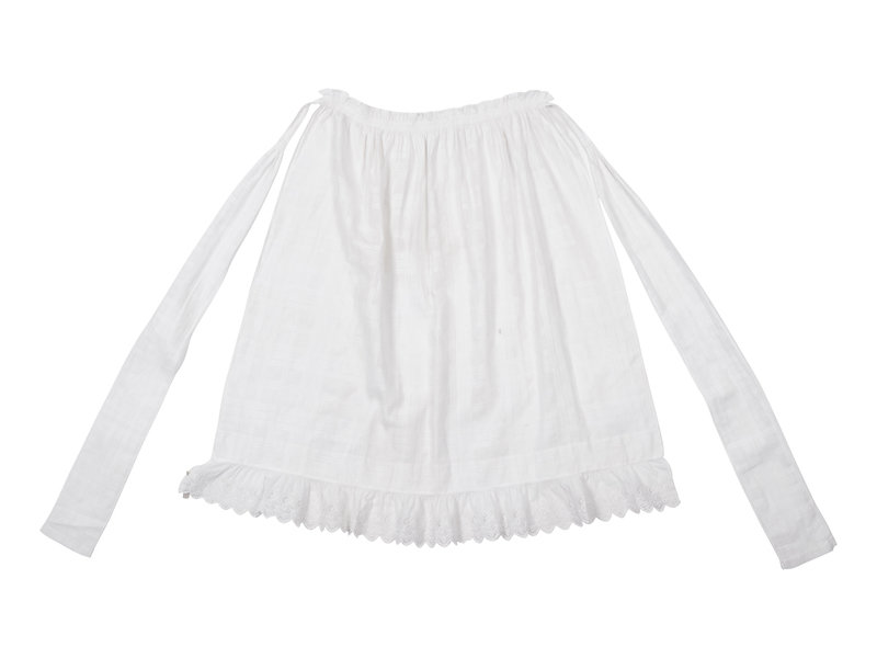 White cotton apron with waist ties and trimmed with white cotton crocheted lace on ties and hemline. 1900.
