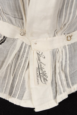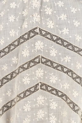 White cotton shirtwaist with pin tucked shoulders, full sleeves with banded cuffs, embroidered front bodice inset with lace ribbon in a chevron pattern, gathered front waist, and center back button closure with tied waist cinch. 1900.
