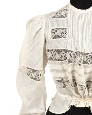 White cotton lawn shirtwaist with lace collar, pin tucked bib, puff capped long sleeves pieced with lace, gathered pieced lower bodice set with lace ribbons, and left side hook and eye closure. 1900.