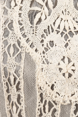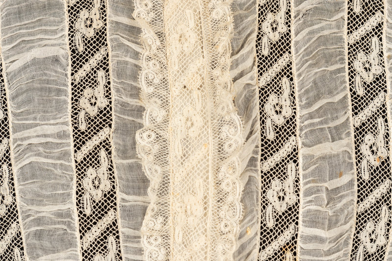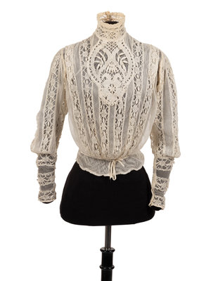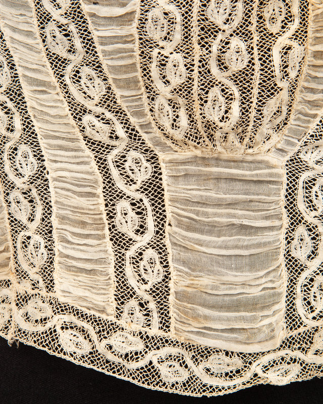 Cream shirred cotton and lace ribbon pieced bodice with ruffled lace collar and long sleeves and center front button closure. 1910.