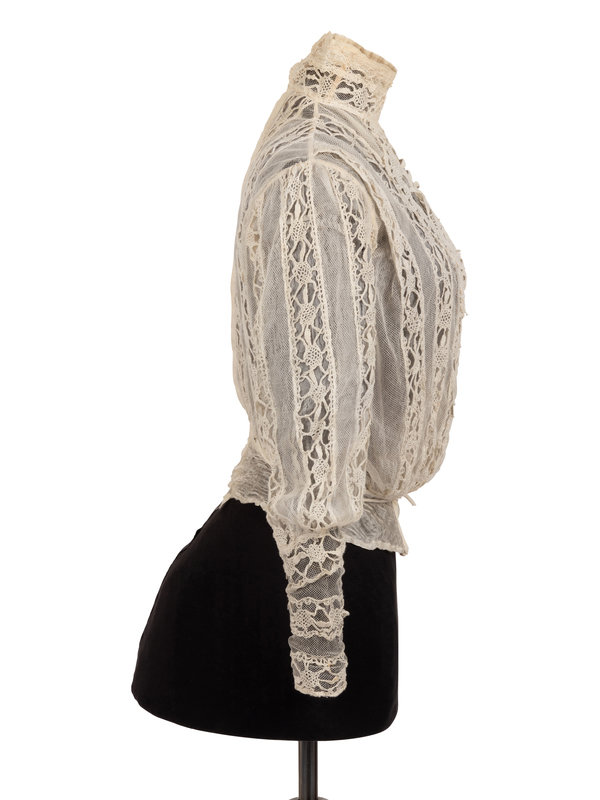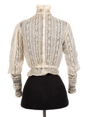 White cotton net lace shirtwaist lined with sheer silk, and boned stand collar, bloused front, fitted long sleeves, and center back button closure with back waist ties. 1890.