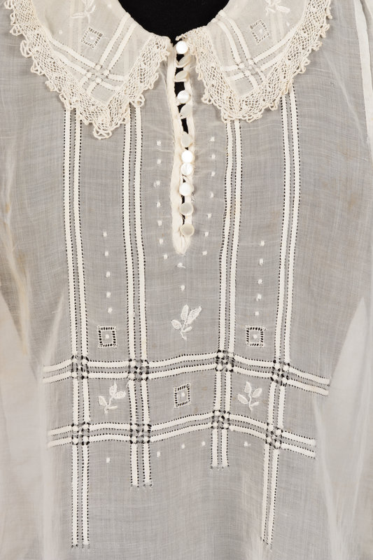 White cotton box cut blouse with squared off rolled collar edged in lace, cuffed long sleeves, gathered back waist, and left front side button closure. 1920.