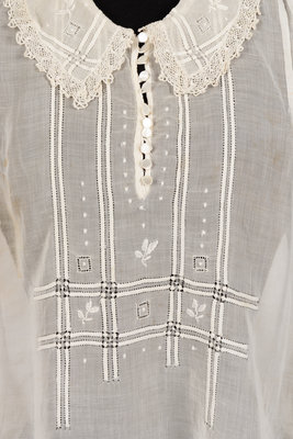 White cotton sheer hand made blouse with squared off rolled collar edged in lace, cuffed long sleeves, gathered back waist with ties, and left front side button closure. 1920.
