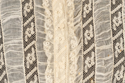 Cream shirred cotton and lace ribbon pieced bodice with lace neckline, short sleeves, and center front hook and eye closure. 1920.