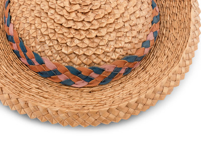Natural woven straw hat with layered brim, shallow cap, woven orange, pink, and blue ribbed ribbon band, and grosgrain ribbon strap.