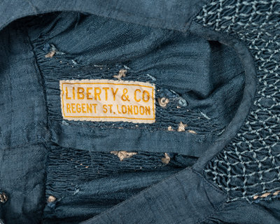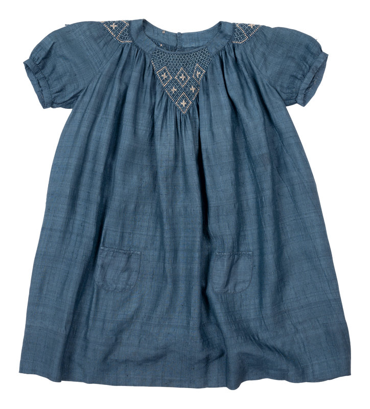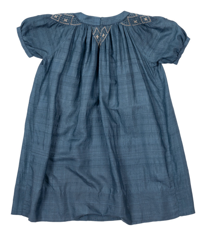 Blue raw silk gathered A-line dress embellished with decorative smocking, raglan puff short sleeves, front patch pockets, and hook and eye closure at center back neckline.