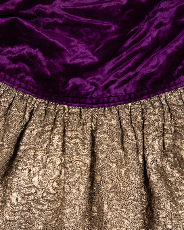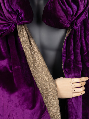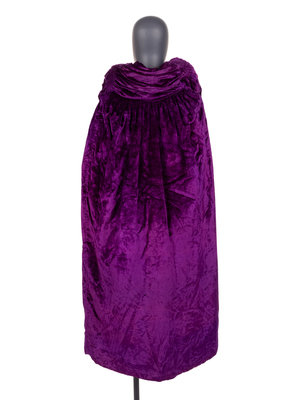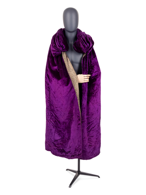 Purple silk panne velvet open front cape with metal silver-thread lamé lining, and stuffed velvet collar with smock detail.