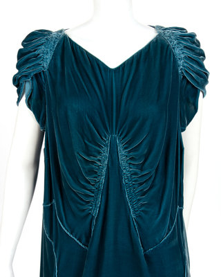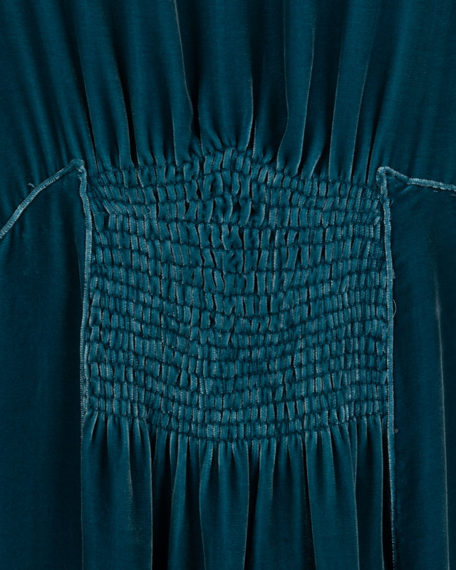 Blue silk velvet dress with V-neckline, shirring along the top of armholes, front bodice and lower back, tulip-style sleeves, and flared skirt. 1920s.