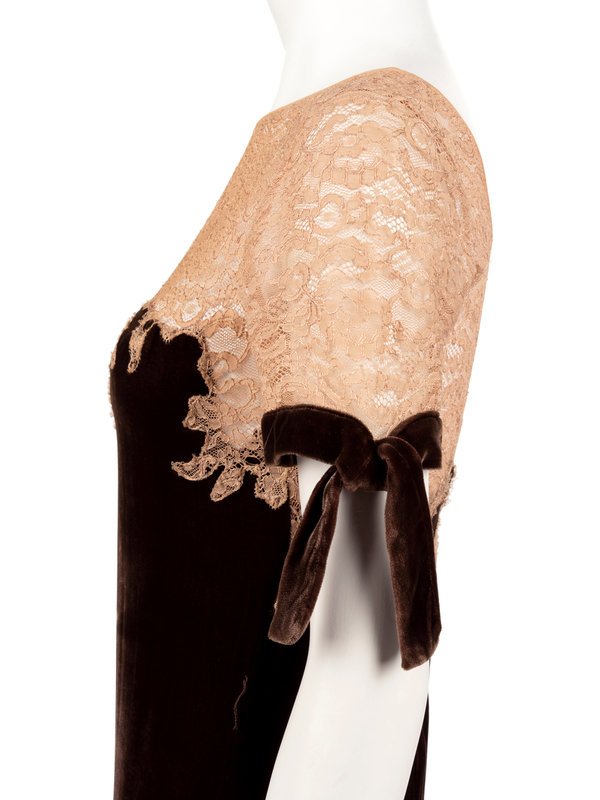 Chocolate brown silk velvet dropped waist dress with beige lace upper bodice, short sleeves with velvet ties, flared skirt with hip flounces, and left side snap closure. 1930s.