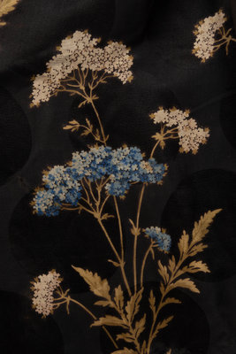 Black silk dress with satin weave polka dots and printed with beige and blue flowers, sheer black silk crepe neckline and dolman sleeves, a black wide sash across a dropped waistline. 1920s.
