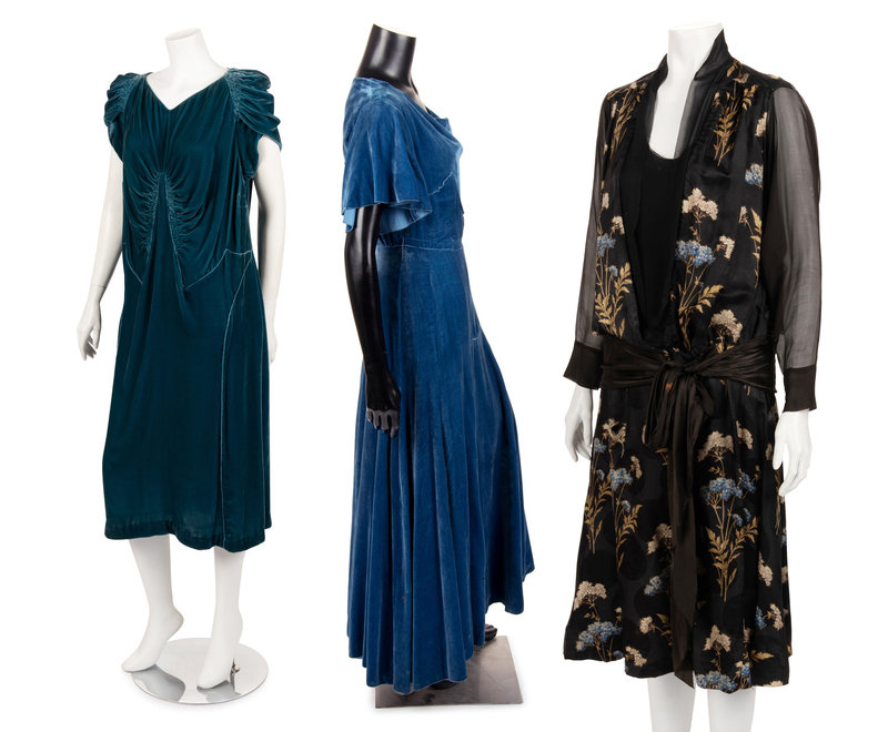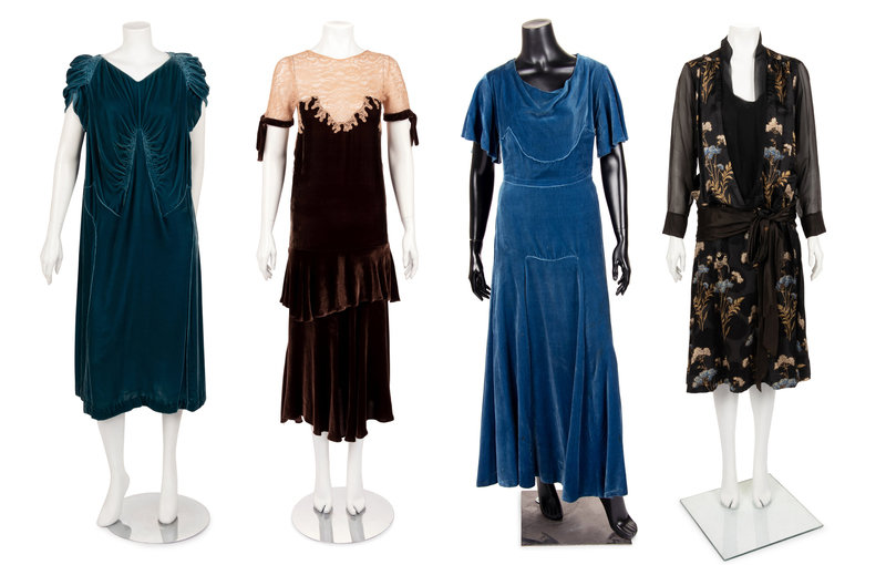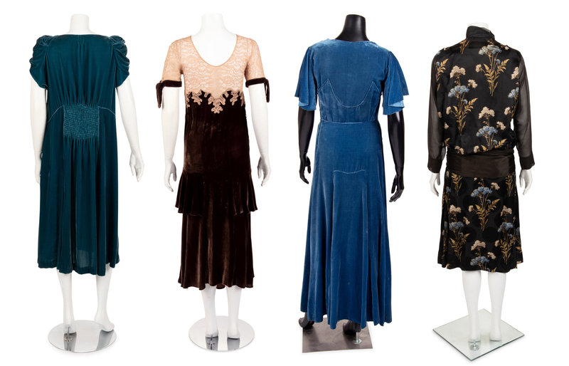 Four 1920-30s Dresses: Three Velvet, One Printed