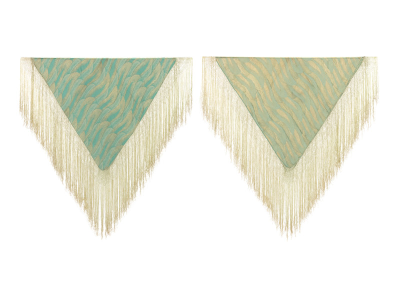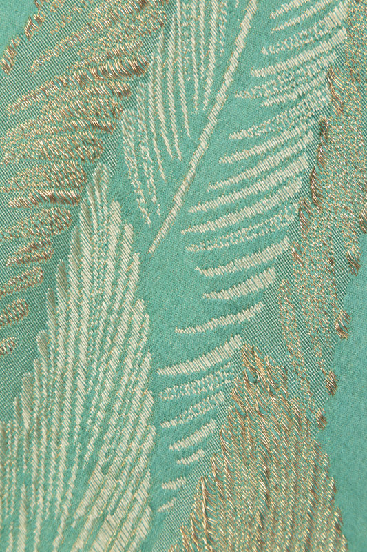 Teal green silk jacquard shawl with gold metallic thread feather pattern and edged with crocheted net fringe.