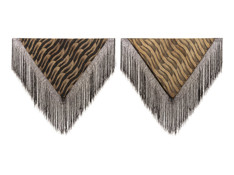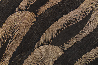 Black silk jacquard shawl with gold metallic thread feather pattern and edged with crocheted net fringe.