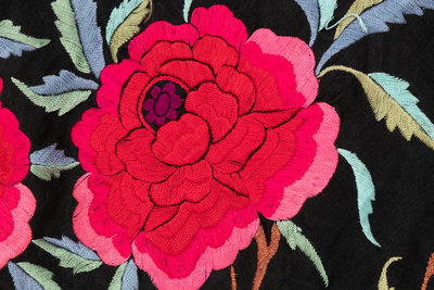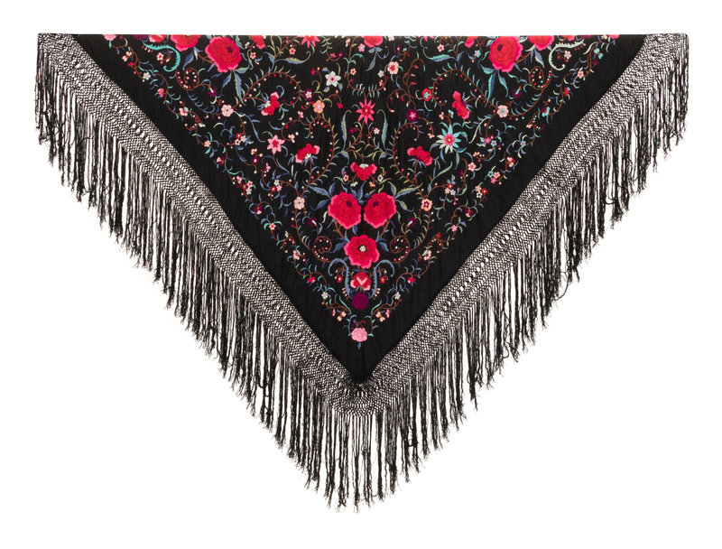Black silk shawl with multi-hued floral silk thread embroidery and edged with crocheted silk thread net and fringe.