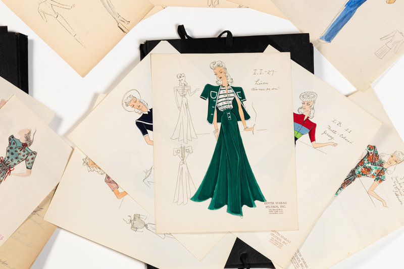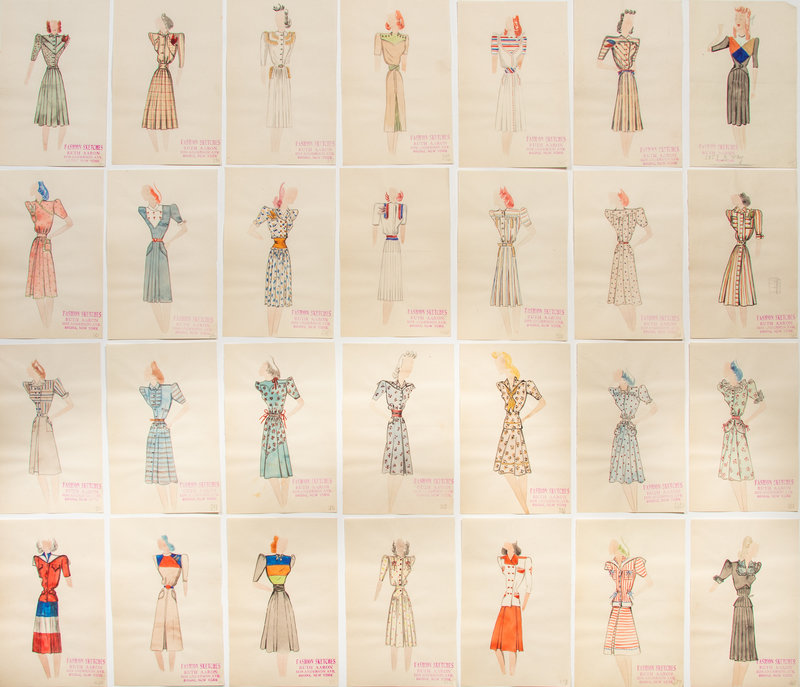 Various designer illustrations and sketches including, Ruth Aaron, Racy Earle, Edyth Sparag Studios INC, Dezine Studio, Minnie Abrams Studios, Caroline G. Davis, and unknown designers.